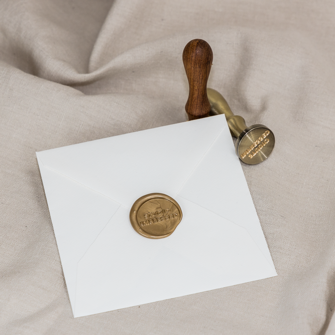 Een met messing gegraveerde lakstempel met handvat, gepersonaliseerd met jouw (bedrijfs)logo. Met een lakstempel met je eigen logo geef jij jou (bedrijfs)stationery een elegante en luxe uitstraling!